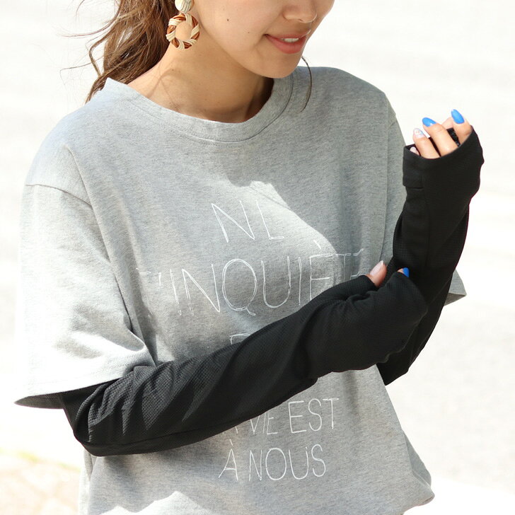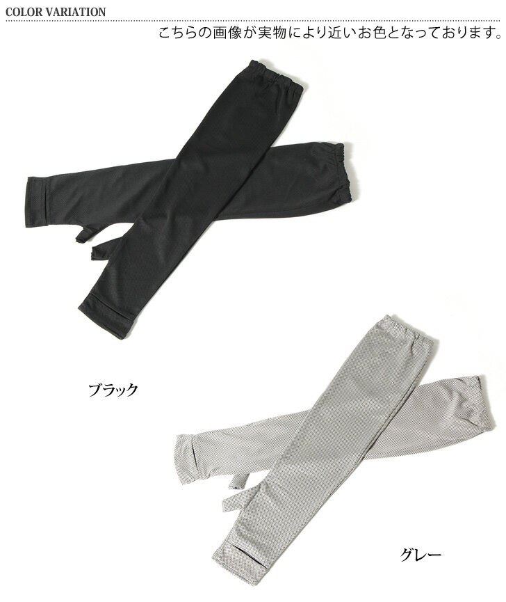 ●UVカット率97%!暑い季節に嬉しい接触冷感加&メッシュ調生地で蒸れにくいアームカバー ■サイズ:【最長】約55cm【手のひら周り】約15?25cm ■重さ:59g ■生産:中国製 ■紫外線カット率:97%(ブラック UPF50、グレー UPF62) 素材 ナイロン55%、ポリエステル45% カラー ブラック(標準的な黒色)グレー(ほんのりクリームがかった薄い灰色) 上記サイズ表はスタッフが採寸し、製品の実寸を掲載しております。