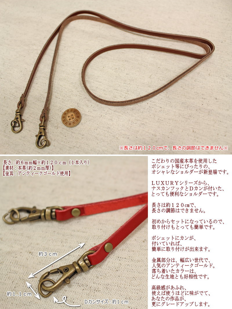 【ラグジュアリーレザーシリーズ】≪Simple shoulder【シンプルショルダー】≫『Dカン付きレザーショルダー』【約6mm幅×約120cm】